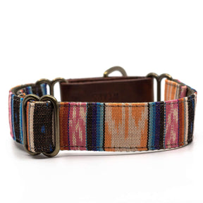 Rankų darbo antkaklis šunims su dirbtinės odos dirželiu ir žalvarine diržo tipo sagtimi. Raštuota antkaklio dalis pagaminta iš 100% medvilnės, austos rankomis Gvatemaloje.