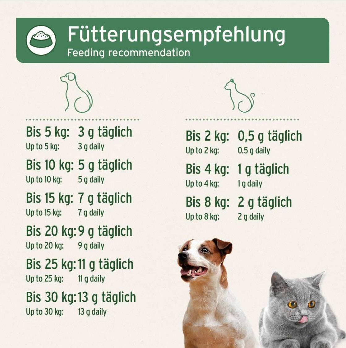 Papildas puikiai tinka kaip natūralus priedas prie kasdienės mitybos, ypač šeriant RAW dieta. Miltelių forma leidžia lengvai sumaišyti su maistu, o pakuotėje esantis dozatorius užtikrina patogų naudojimą.