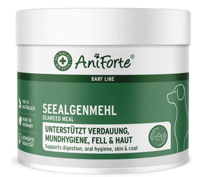 Aniforte jūros dumblių mišinys yra stambiai sumaltas natūralus produktas, išgaunamas iš jūros dumblių. Prisotinti įvairių maistinių medžiagų, šie milteliai maitina jūsų šunį iš vidaus. Jūros dumblių mišinys ypač pasiteisina juodų šunų kailio spalvos palaikymui. Papildas yra miltelių formos, su dozatoriumi pakuotėje. Galima lengvai sumaišyti su maistu.