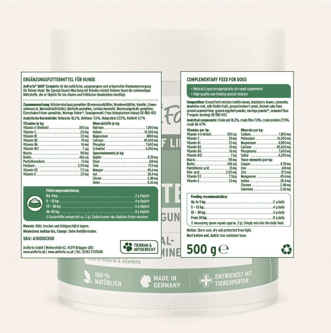 Aniforte BARF Complete šunims yra 100% natūralus, subalansuotas ir rūšiai tinkamas visapusiškas papildas, sukurtas šunims, šeriamiems BARF (biologiškai tinkama žalia mityba) dieta. Šis kruopščiai paruoštas mišinys su žolelėmis suteikia jūsų šuniui būtinus vitaminus ir mineralus, kurių jam kasdien reikia sveikam ir laimingam gyvenimui. Nors šis produktas buvo sukurtas žalia dieta šeriamiems šunims, jis gali būti naudojamas bet kurio šuns dietai praturtinti. Papildas yra miltelių formos, parduodamas su dozatoriumi pakuotėje. Galima lengvai sumaišyti su maistu.